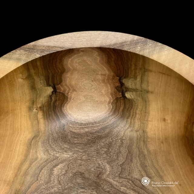 Aus einem Stück nass gedrechselt und anschliessend 4 Jahre langsam, schonend getrocknet. Im zweiten „dreh“ wird der natürliche Verzug egalisiert und feingeschliffen, so dass die Oberflächenbehandlung erfolgen kann.